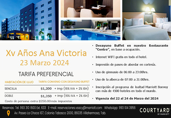 Tarifa especial para los invitados que gusten hospedarse, solo deben llamar al número de reservaciones y comentar que vienen a los XV años de Ana Victoria.
